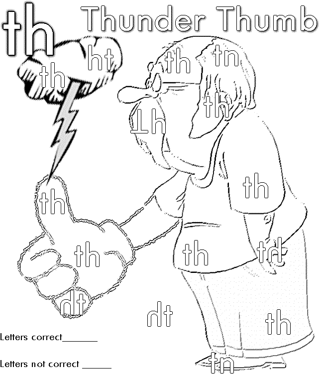 Directions: You can see the letters "th" appear all over Thunder Thumb's body. Many of the letters are written correctly. Sometimes the letters "th" are written backwards or with the wrong letter. Your job is to find the correct "th" letters and color them green and find any incorrect "th" letters and color them red. In the space above, write down how many times "th" was correct and how many times it wasn't. If you get done early you can color the rest of Thunder Thumb, but only with the colors yellow and black (otherwise it is hard to read). |